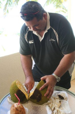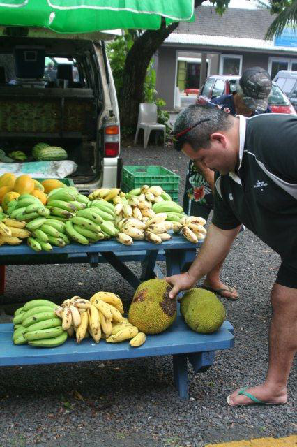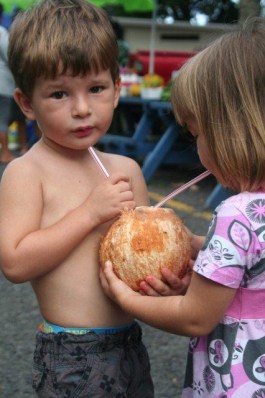 Fish like wahoo, tuna steak and parrot fish. Fruits like pawpaw, guava, star fruit (my favourite), local bananas, coconut and mango. Speaking of coconut, my son said I had to try coconut milk so I bought one for $2 at the Saturday market and walked around sipping through a straw (like the kids in the photo below). Different, but not worth repeating. Sadly, the wedding was that afternoon and we were busy for the next day or so and I didn’t get a chance to break it open and taste the flesh inside. Next time!