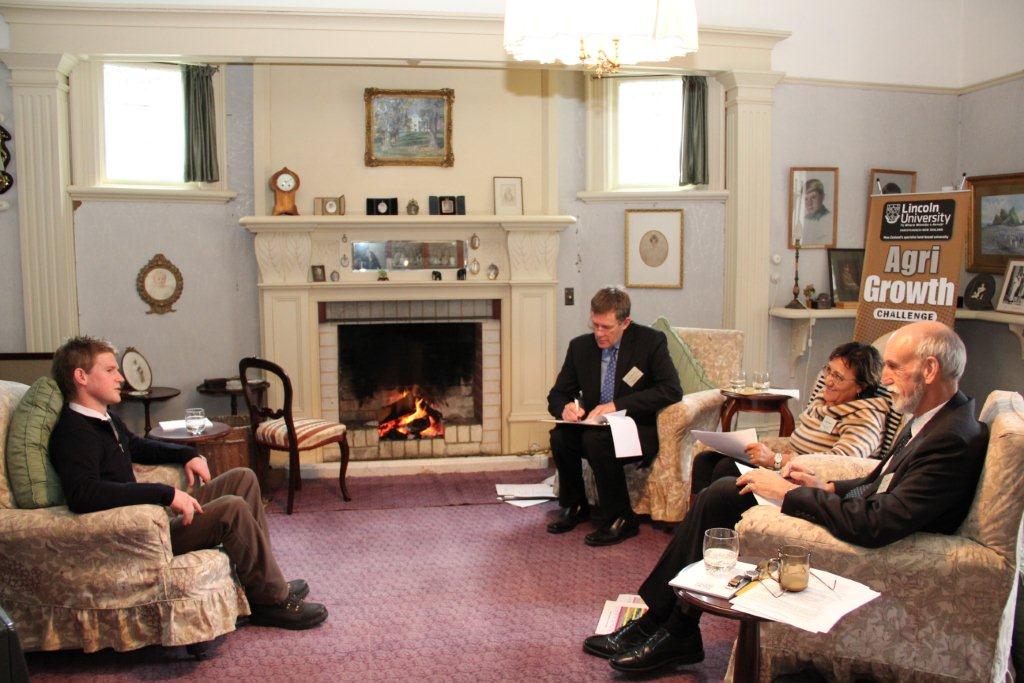 Will being interviewed by a panel of three judges for 45 minutes: from left Leo Vollebregt 1987 Young Farmer of the Year, Mavis Mullins from the Golden Shears and Dr Patrick Aldwell Dean of the Faculty of Commerce at Lincoln University.